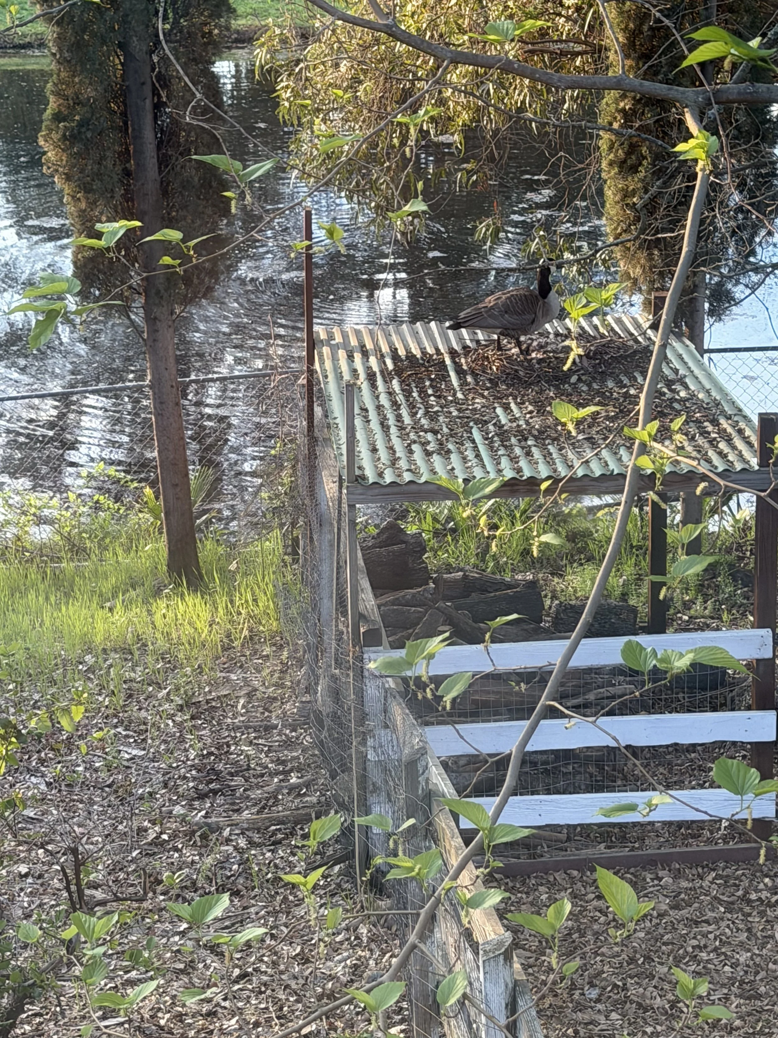 Ok, she's back. The mother goose has apparently disregarded the threat of the Hawk nest and has laid about 8 eggs in her old spot. Today she covered the eggs up and joined her spouse in the neighbors pond. At the same time there were 2 other geese out front admiring the Mona Lisa when our new mom and her spouse, came flying over to chase them away. I assume it is because they want the Lisa untouched until her children are born, so the little geese can admire such great art.
